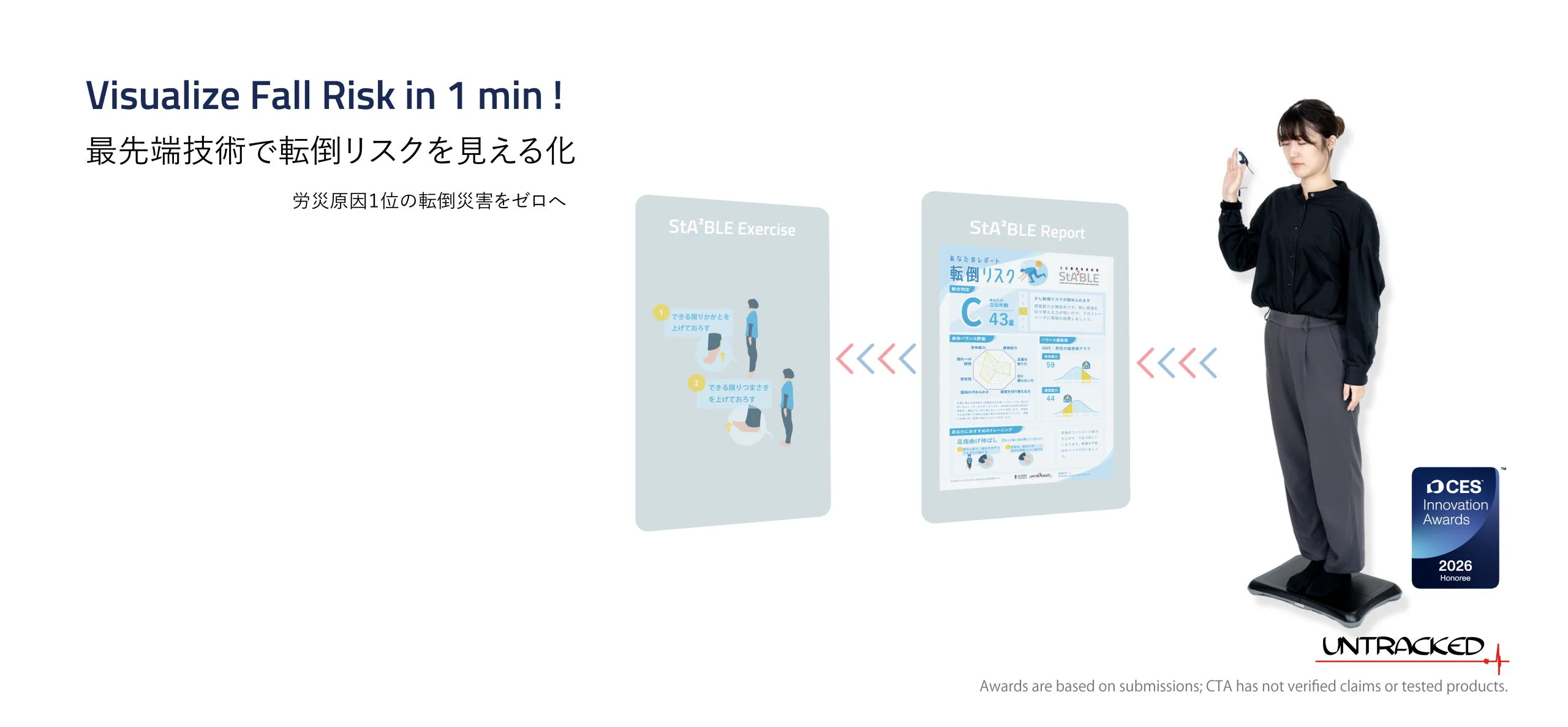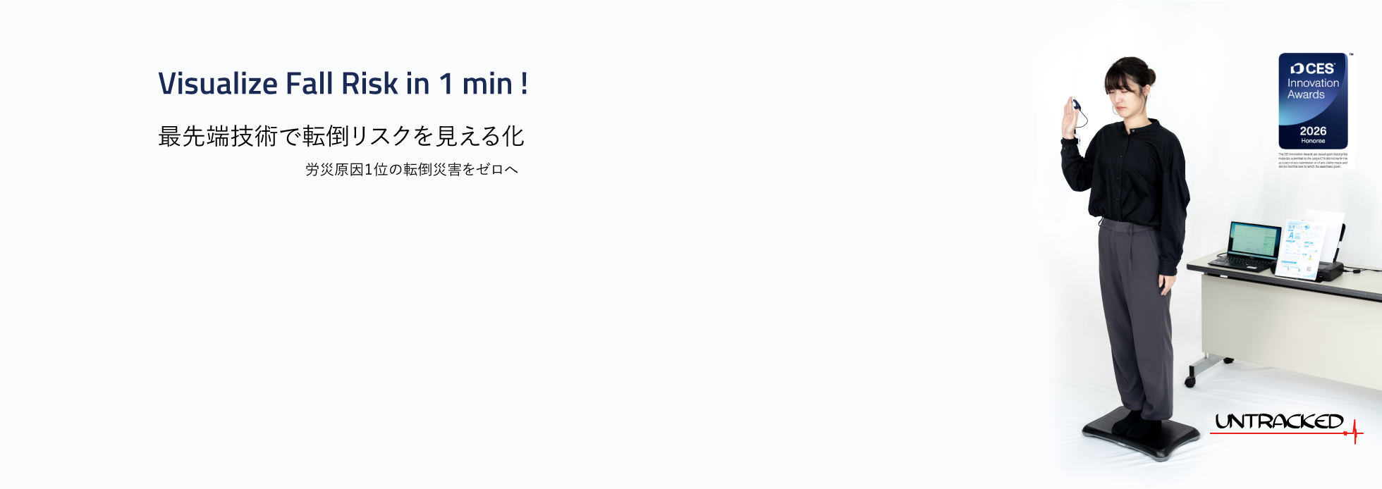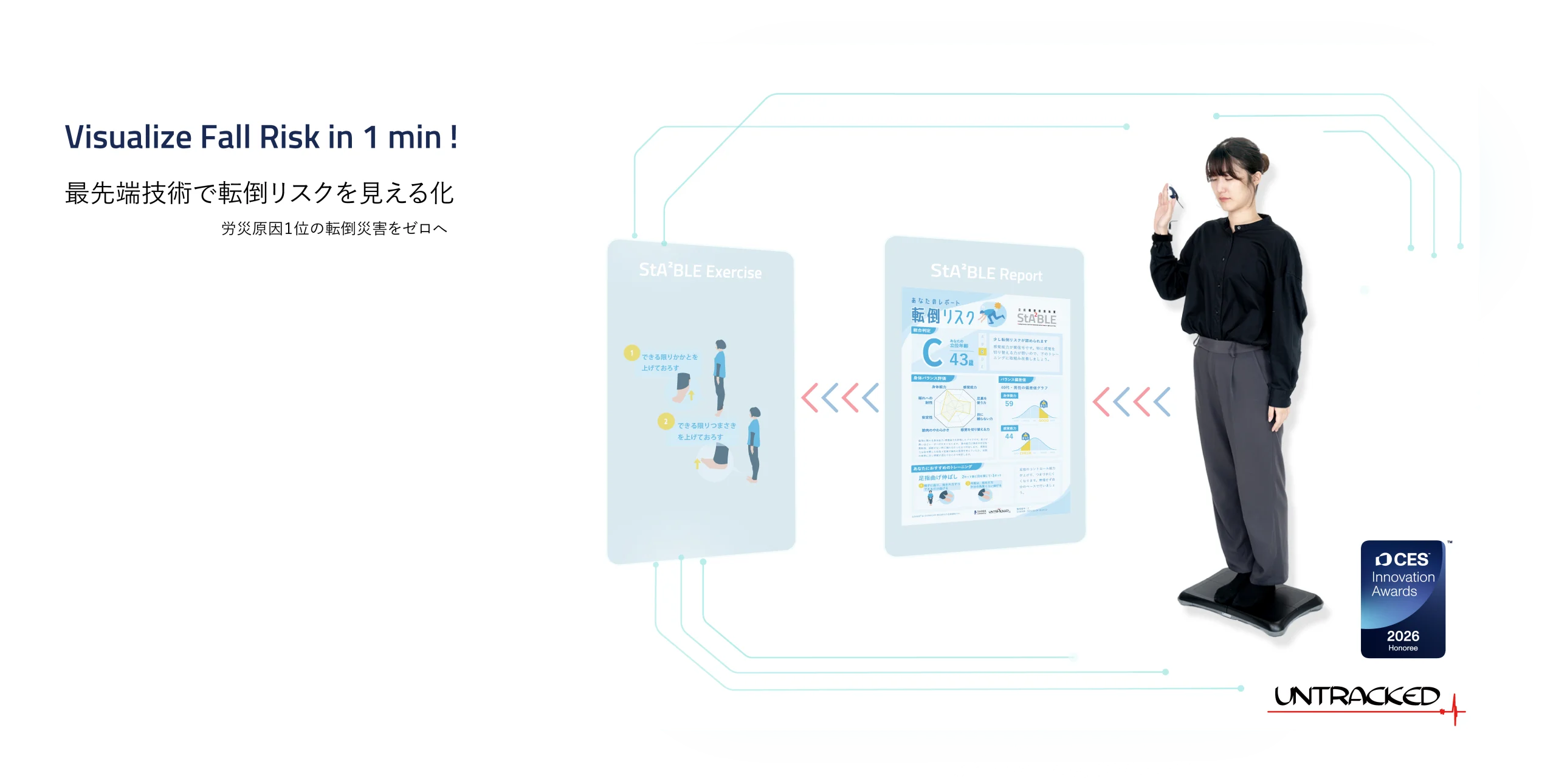 労働人口の高齢化にともない転倒事故は、いまや大きな社会問題の一つ。しかし、その対策は難しいとされています。労災原因1位※の転倒災害を未然に防ぐために開発した、転倒リスク計測装置StA²BLE(ステイルブル)は、わずか1分で「身体機能」と「感覚機能」を計測し、隠れた転倒リスクを正確に評価。リスクの高い場合は、運動による改善策を提案します。労働者の転倒リスクを把握することで、安心・安全な労働環境の維持に貢献します。※厚生労働省:2022年労働災害発生状況