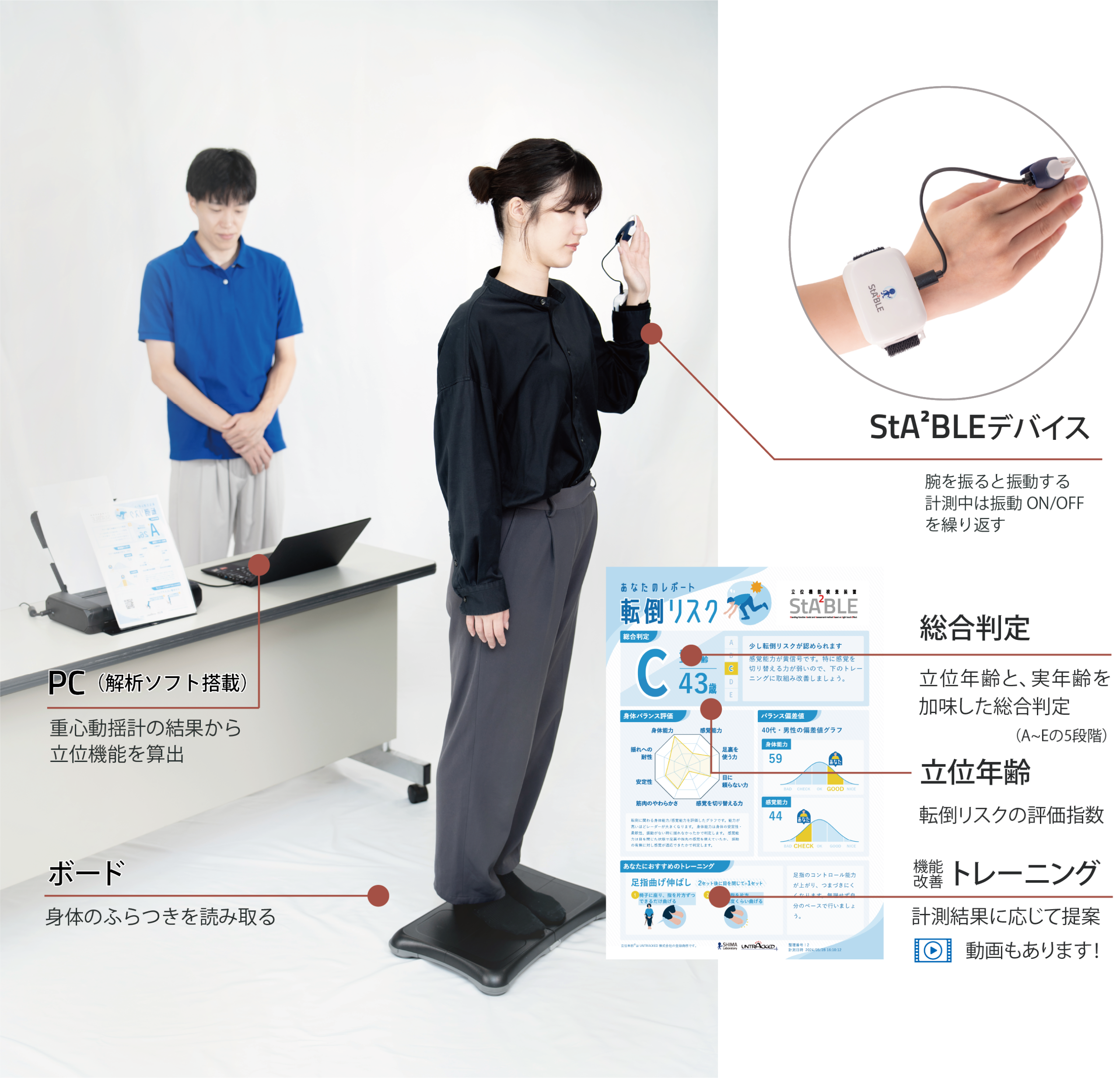 StA²BLEは、転倒の原因となる「身体機能」と「感覚機能」の両方を独自の技術で計測。結果を数値で「見える化」する、世界でトップクラスの転倒リスク計測装置。
